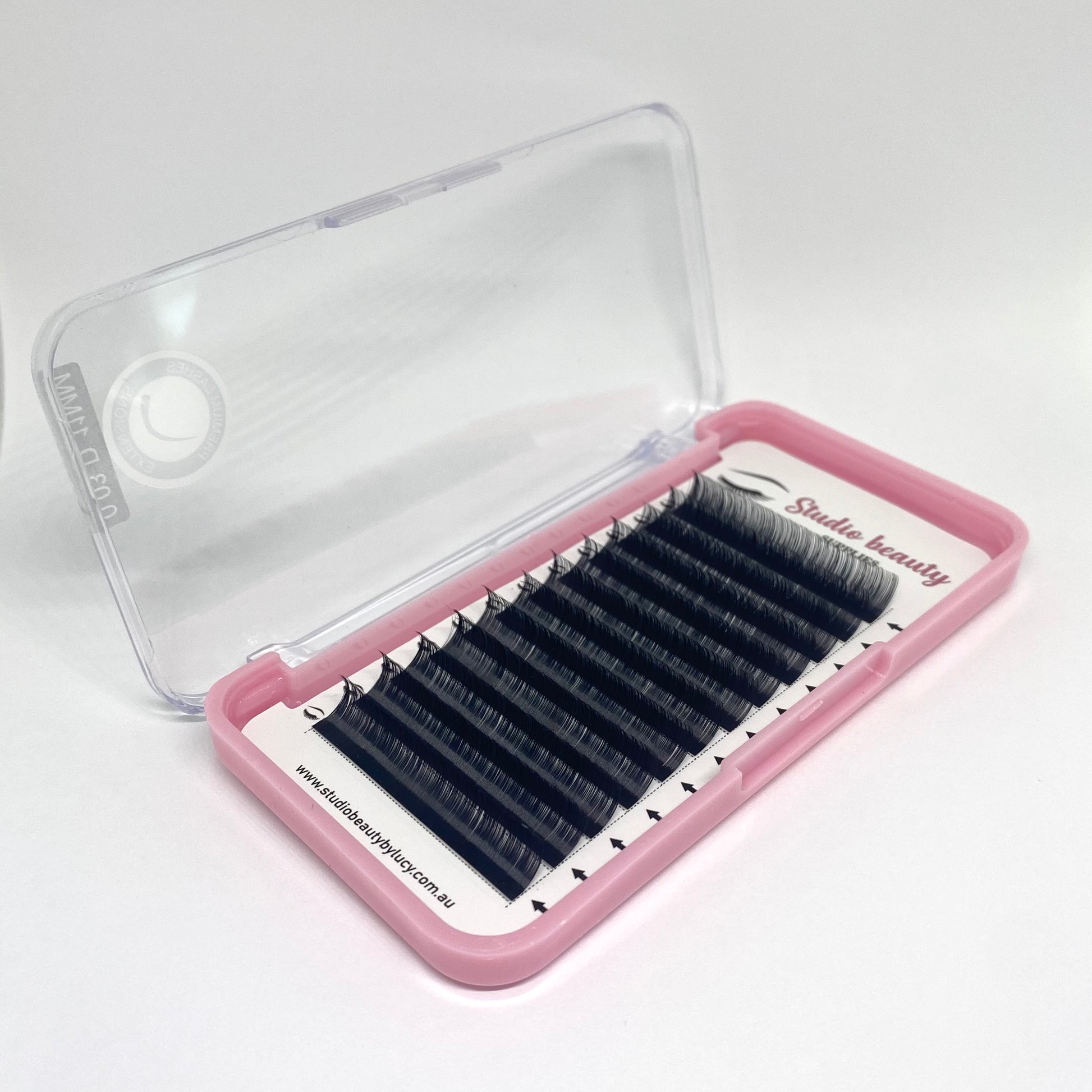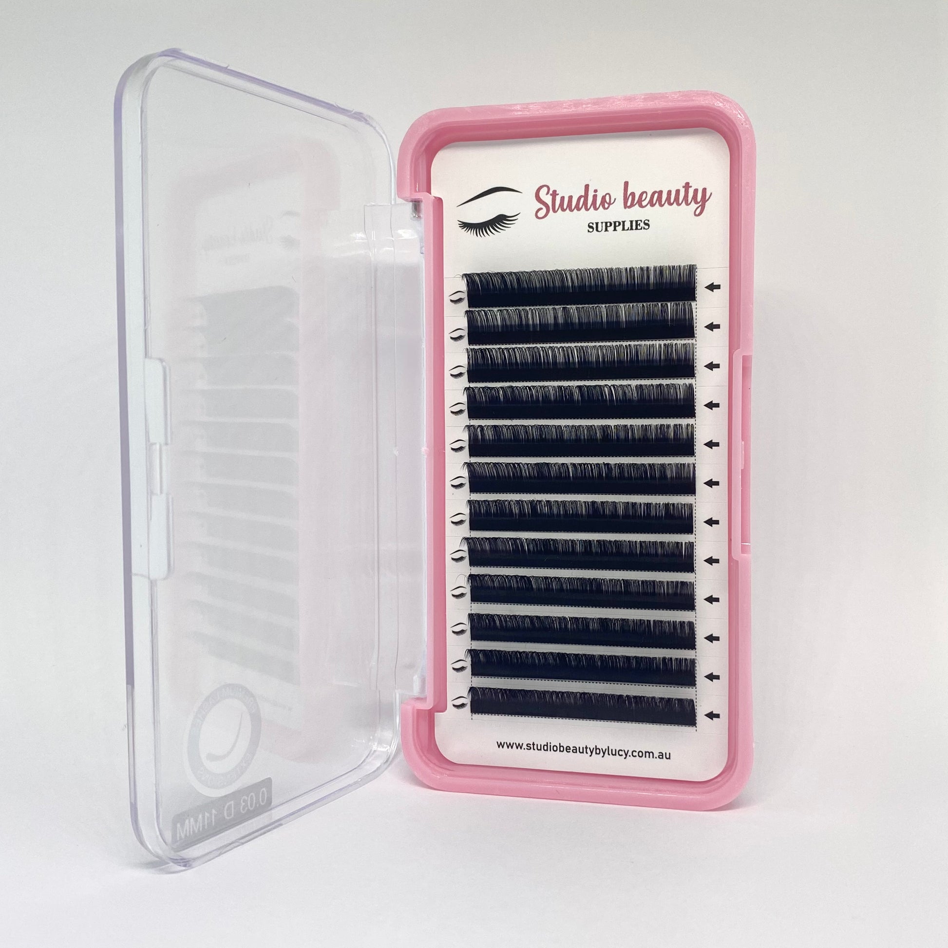 Highest quality lashes with a 0.03mm diameter and a D curl, jet black in colour with lengths 8-15mm available. Easy to fan, with foil backings on the strip means no more sticky paper left behind on your lash tiles! Perfect for Mega Volume.